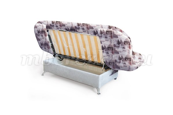 Просторное спальное место за счет отсутствия боковин и подлокотников подойдет для сна даже очень высокому человеку. Конструкция дивана имеет вместительную нишу, в которой можно хранить постельные принадлежности или другие вещи. Каркас дивана-кровати с латовыми решетками. Механизм трансформации «клик-кляк» с ортопедическим основанием.