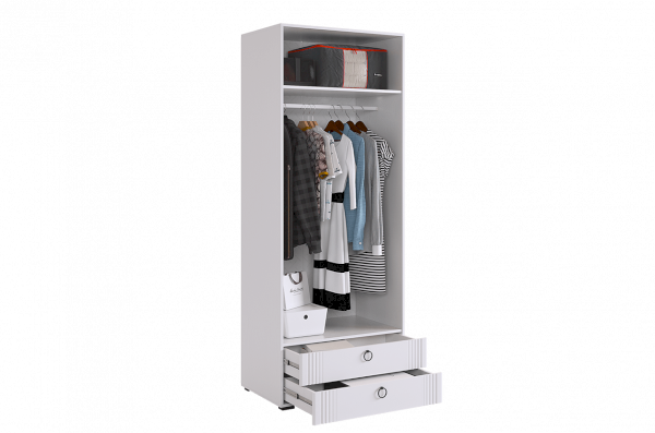 - Внутреннее наполнение включает штангу для одежды, полки и два удобных ящика с шариковыми направляющими.