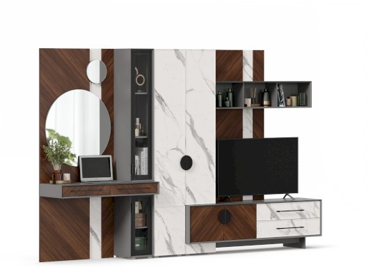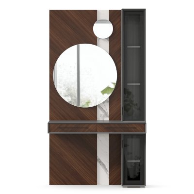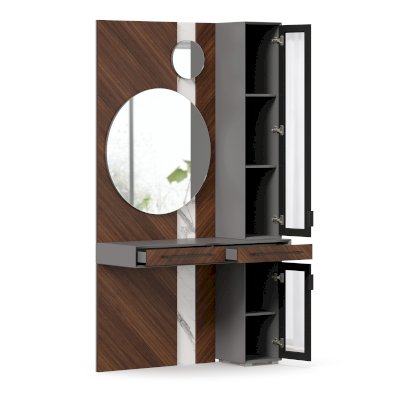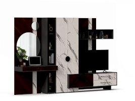• Модуль скомбинирован из наборной панели с зеркалами, шкафа одностворчатого и стола с выдвижными ящиками