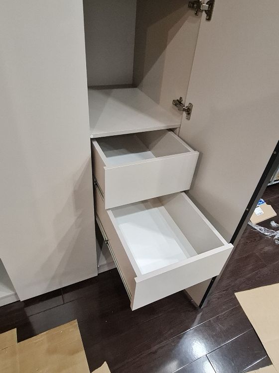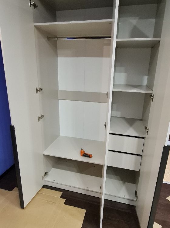 хороший шкаф, нареканий нет, немного неуобно было собирать одному человеку из за скрытого крепления полок