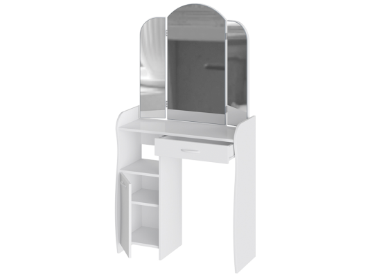 Помимо внешней привлекательности стол оснащен большим зеркалом с поворотными зеркальными створками, вместительную столешницу под которой располагается выдвижной ящик, открытая ниша для хранения и секция с дверцей, где можно разместить все необходимые аксессуары и косметику. Удобные отсеки помогут поддерживать порядок и удобство в Вашем уголке красоты.