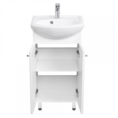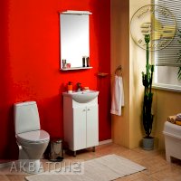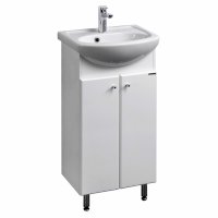 Комплект состоит из тумбы-умывальника с раковиной и зеркала с подсветкой и полкой. Несмотря на небольшие размеры, мебель обладает большими функциональными возможностями. Раковина шириной 45 см имеет удобную эргономичную форму, не выпирает, но и не даёт разбрызгиваться воде.