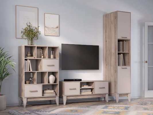 Стильный и функциональный пенал «Скандика» - незаменимый предмет мебели в гостиной или личной комнате. Модель состоит из четырех полок, скрытых за дверцами и двух открытых полок, на которых можно разместить книги, документы, предметы декора, игрушки и одежду. Створки плотно фиксируются на магнитах.
