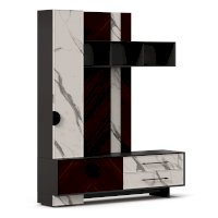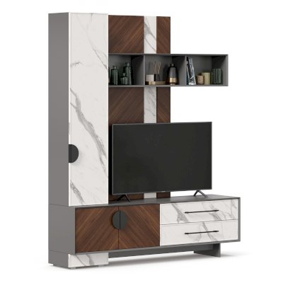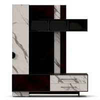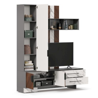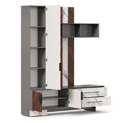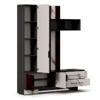 • Модуль скомбинирован из наборной панели, шкафа одностворчатого, тумбы для ТВ и открытых полок