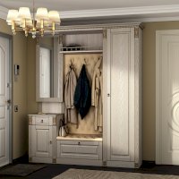 Прихожая выполнена в классическом стиле с декоративными элементами. Фасады и декоративные элементы патинированы, патина наносится вручную, по классической итальянской технологии и защищена матовым лаком. Мягкие элементы (вешалка и сиденье) выполнены из экокожи, декорированы каретной стяжкой.