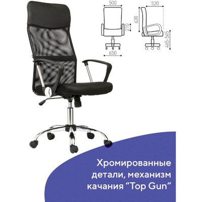 Кресло оснащено механизмом качания «топ-ган» с регулировкой под вес пользователя и возможностью фиксации спинки в рабочем положении.