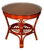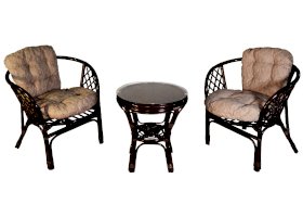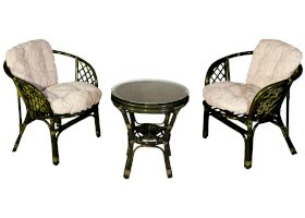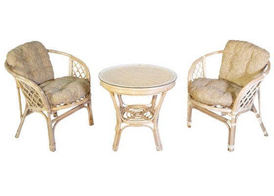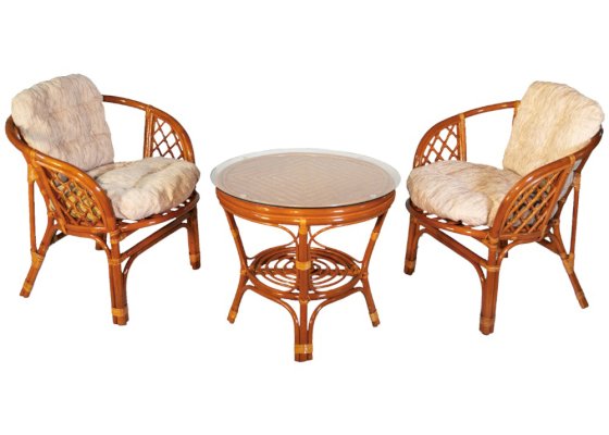 Комплект из натурального ротанга, состоящий из двух кресел и круглого столика с плетеной столешницей. Стекло входит в комплект.