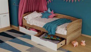 Топчан в скандинавском стиле со скругленным изголовьем и высокой спинкой имеет два больших ящика, с помощью множества роликов его легко выдвинуть. Для безопасности и удобства открывания выдвижной ящик вместо ручек оснащен выемками на лицевой части фасада. Высокая спинка в топчане предохраняет от соприкосновения с холодной стеной во время сна. Пользоваться кроватью может взрослый и ребенок любого возраста, так как она имеет размеры стандартной кровати 90х200см, устойчивую конструкцию и нейтральный для интерьера цвет. Идеально компонуется со всеми модулями системы Стелс. Мебель выполнена из высококачественных экологичных материалов.