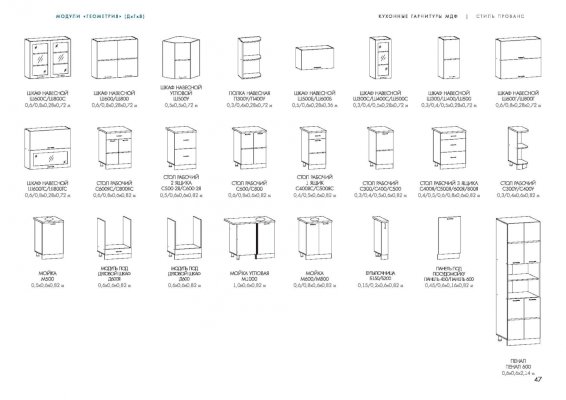Набор кухонной мебели «Геометрия» получил свое название благодаря оригинальному дизайну. Дело в том, что его фасады украшены незатейливыми симметричными узорами, состоящими из небольших ромбов. Также комплекту присущи симметрия и простота форм. У покупателей есть возможность выбирать цветовое решение: в ассортименте изделия оттенков топаз, тирамису, гранат, алмонд.