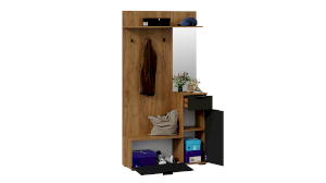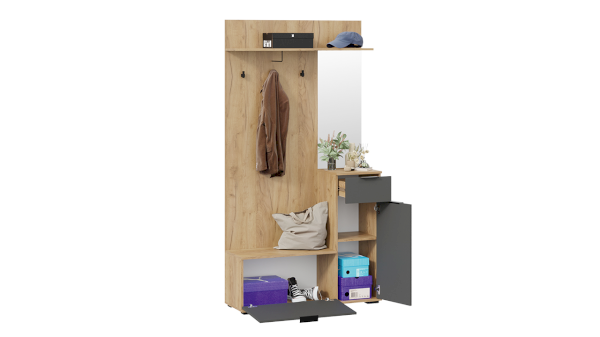 При своей небольшой глубине прихожая «Эвита» является функциональной мебелью, ведь в её конструкции предусмотрены: открытая секция с крючками и штангой для одежды в цвет лицевой фурнитуры, компактное зеркало, открытая верхняя полка, на которой можно расположить головные уборы и закрытые ниши, в которых можно спрятать от посторонних глаз все необходимые предметы.