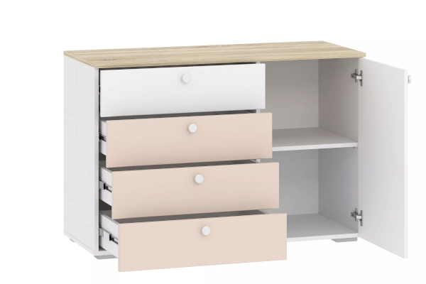 Три удобных выдвижных ящика и боковое отделение с полками станут вместительным местом для хранения белья, предметов одежды и аксессуаров. Выдвижные ящики оснащены шариковыми направляющими полного выдвижения, равномерно распределяют вес содержимого и обеспечивают плавный бесшумный ход ящика. Скругленные ручки-кнопки  не имеют острых граней. Ящики для хранения белья позволят навести порядок в комнате и расположить вещи.