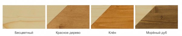 Цвета на выбор: бесцветный, клён, орех, красное дерево, морёный дуб, жженое дерево.